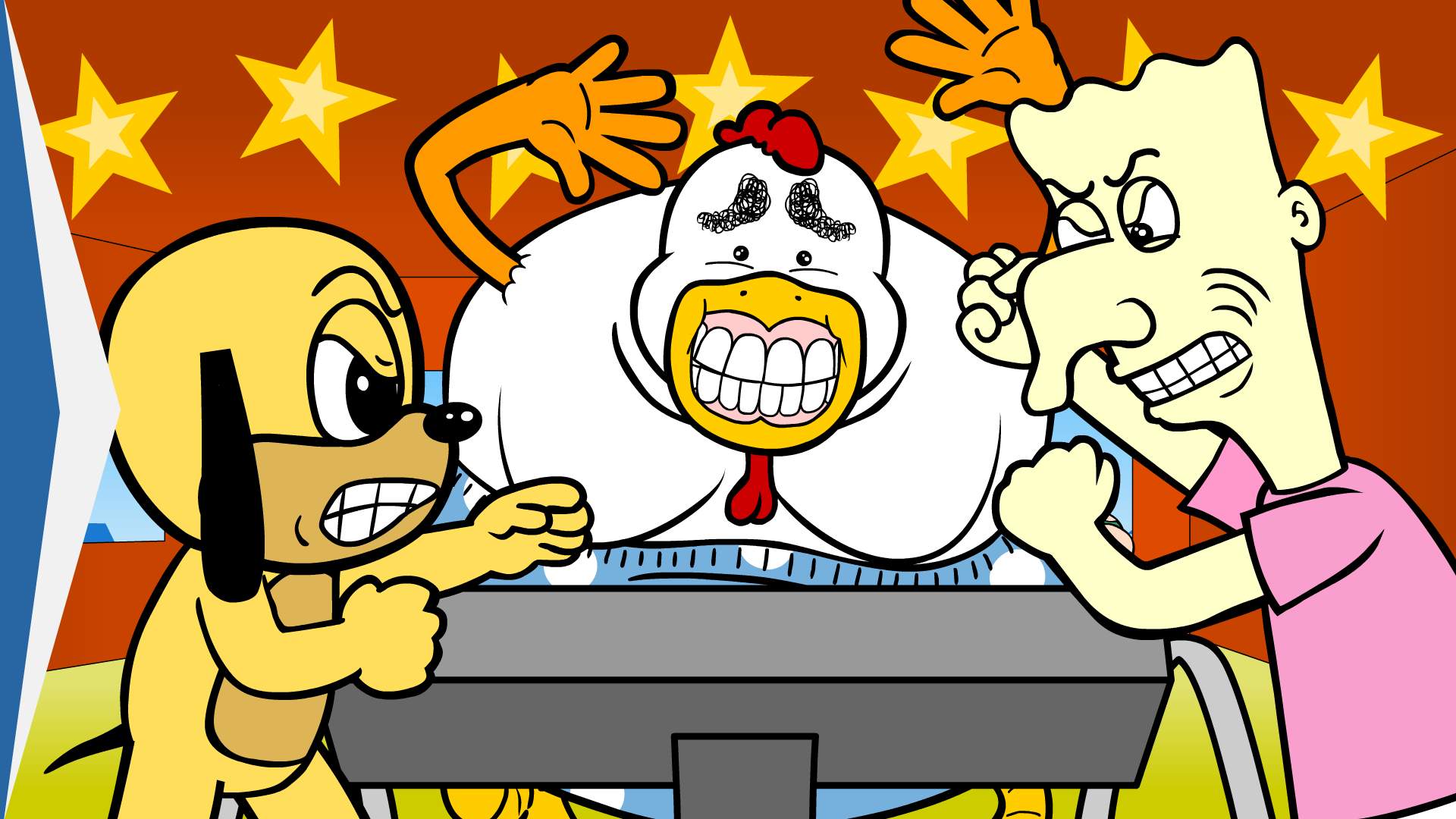 O Frango de Dentadura precisou entrar para a academia e malhar muito depois de tomar 287 litros de iogurte de milho. Se não bastasse o sobrepeso, falta apenas uma semana para o XI Festival da Cintura Fina de Vale Azul! Tobias e Joca estão na torcida, sendo um contra e o outro a favor.Será que o nosso amigo galináceo vai conseguir emagrecer a tempo de concorrer entre os donos das cinturas mais finas do bairro?! Ai, meu São Galináceo!