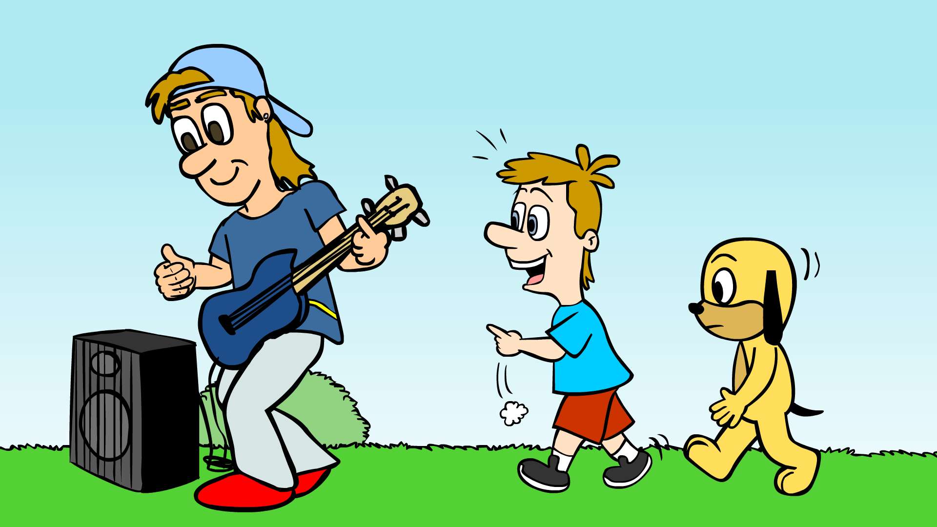 O garoto Gildo chama o cachorro Tobias para conhecer o estilo musical de Vicente, seu primo baixista.