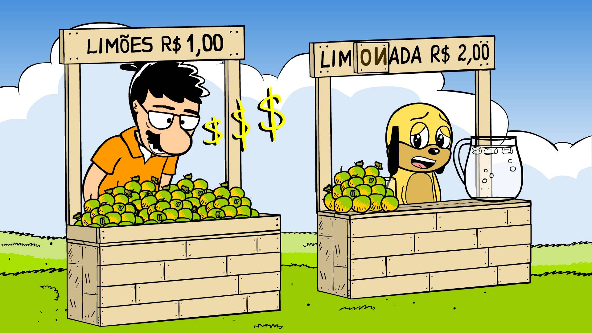 Tobias voltou a vender limonada com limões de verdade, mas encontrou um fornecedor de matéria-prima bem careiro.